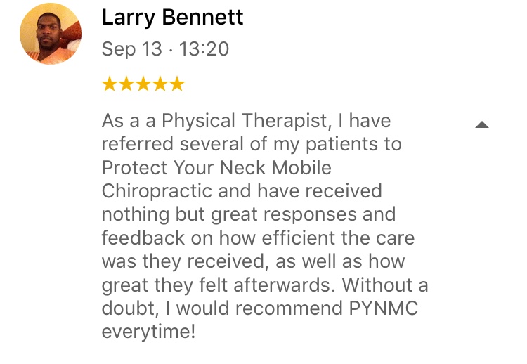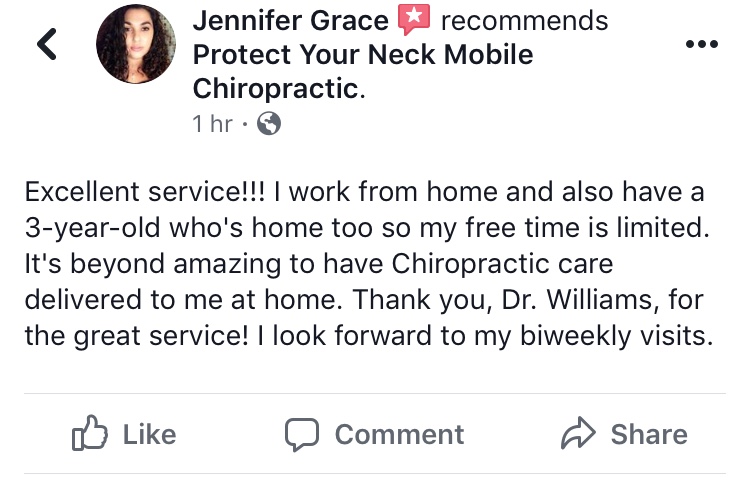 WE COME TO YOU!! 980.699.6996 PROTECTYOURNECKMOBILECHIRO@GMAIL.COM Monday to Friday 8:00 AM - 2:00 PM by appointment only. Emergency visits are available after 5:00 PM - 6:30 PM Monday to Friday. Closed Sunday